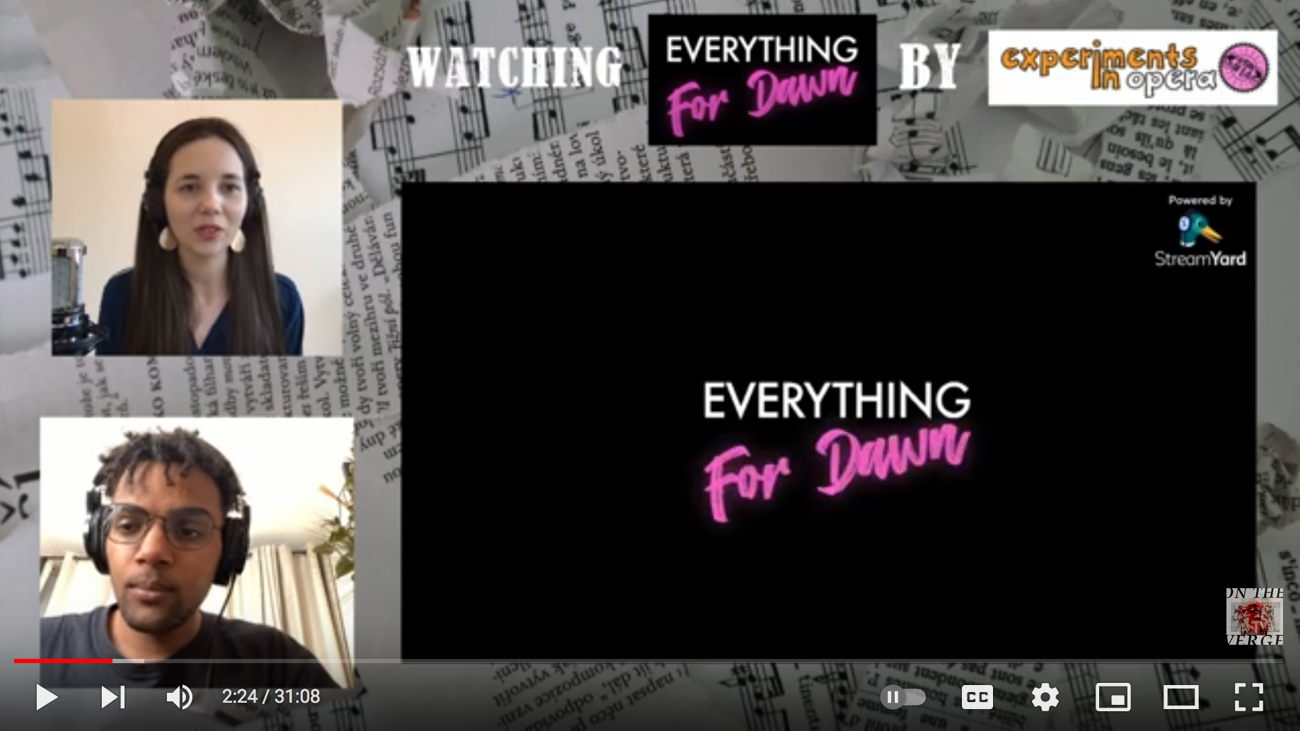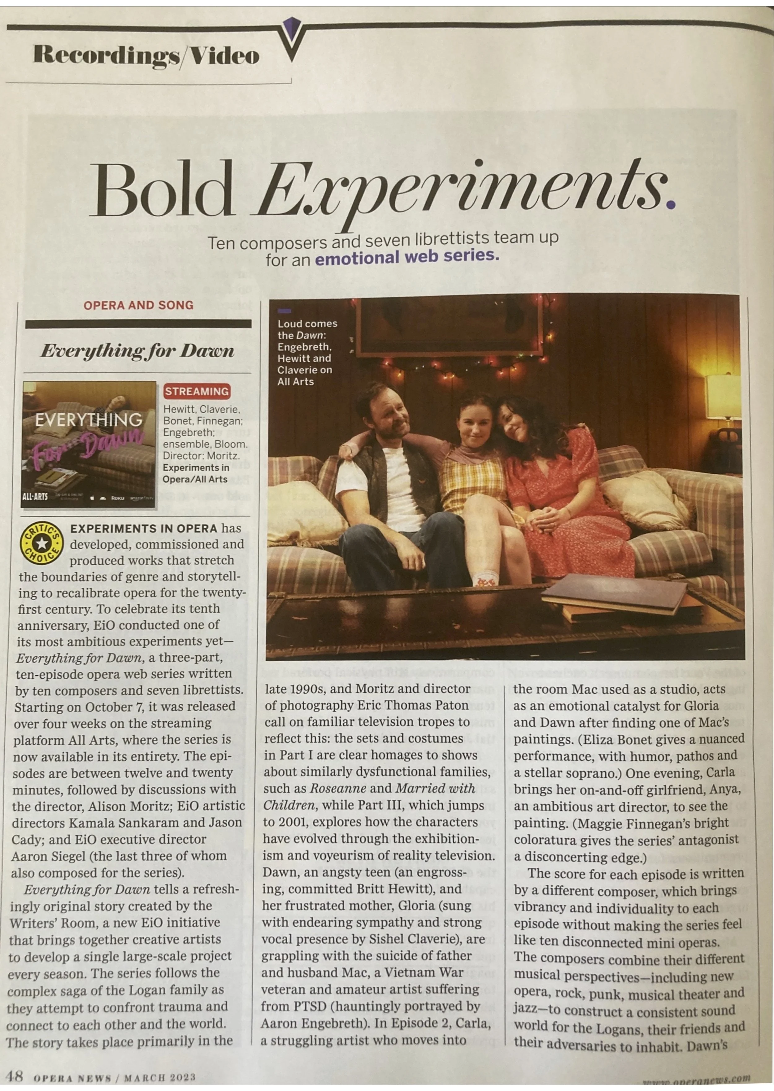 Everything for Dawn is an original coming-of-age story spanning the 1990s. Dawn is a teenager dealing with the impact of her father’s suicide. Her personal tragedy becomes public when his paintings become celebrated as “outsider art.” Everything for Dawn celebrates multiple voices and aesthetic styles. A different pair of librettists and composers wrote each episode in this 10-episode TV opera.